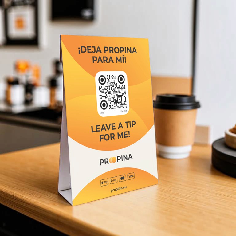 Una tarjeta con un código QR sirve como recordatorio amable para dejar una propina.